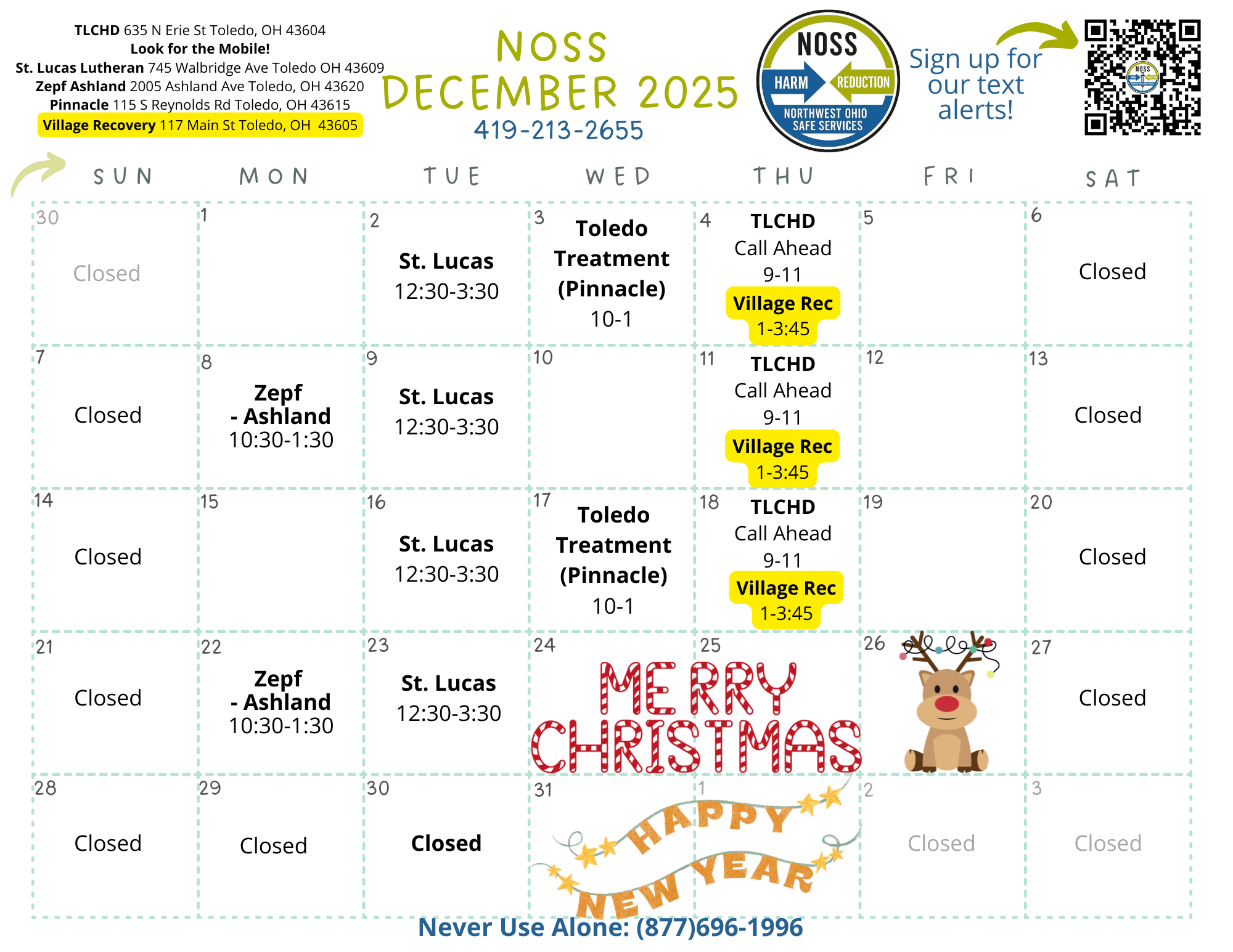 Always carry naloxone. Naloxone is available at no cost through NOSS and the Toledo-Lucas County Health Department. Visit the Naloxone page for more information on how to get your naloxone kit.